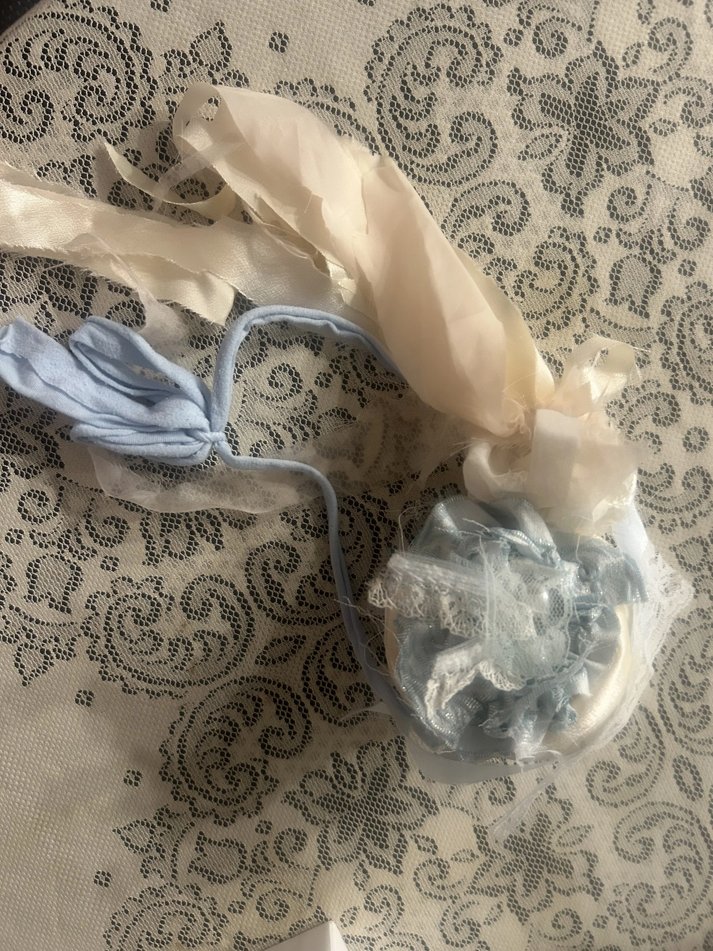 second-hand fabric, lace, doilies, beads, embellishments; ~16×28”