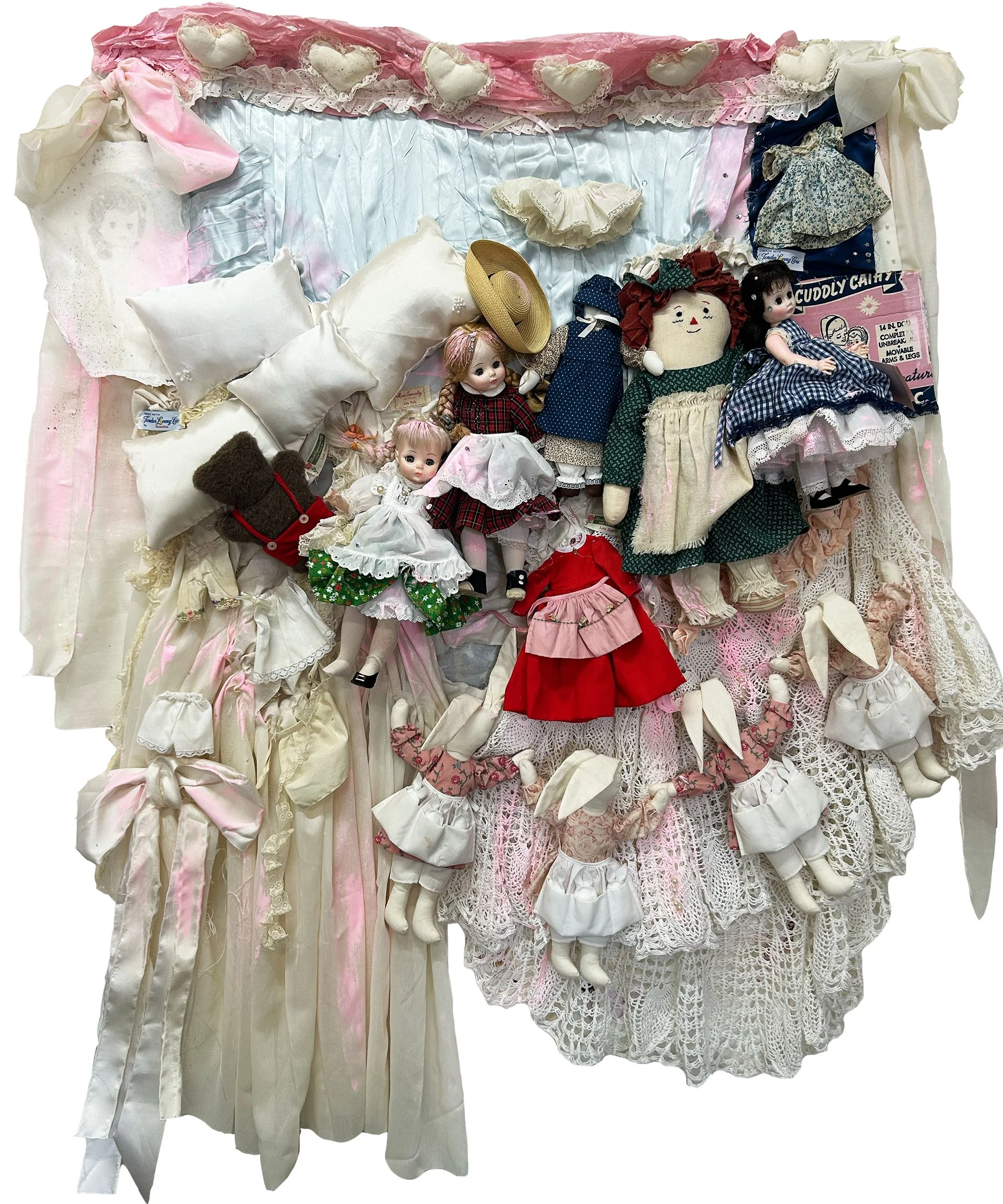 second hand fabric, doilies, dolls, paint, embellishments; ~50×54”